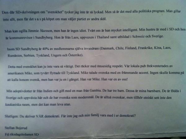 Den där SD-skrivningen om svenskhet tycker jag inte är så lyckad. Men så är det med alla politiska program. Man gillar inte allt, men får det s a s på köpet om man väljer partiet av andra skäl. Man kan ogilla Jimmie Åkesson, men han är ingen idiot. Tvärt om är han mycket intelligent. Min hustru är med i SD och hon är kommunrevisor i Sundbyberg. Hon är från Laos, uppvuxen i Thailand samt utbildad i Schweiz och Sverige.Inom SD Sundbyberg är 40% av medlemmarna själva invandrare (Danmark, Chile, Finland, Frankrike, Kina, Laos, Rumänien, Serbien, Tyskland, Ungern och Österriket). Detta med svenskhet kan ju inte vara så viktigt. Det räcker med ömsesidig respekt. Vår lokala pub frekventerades av amerikanen Mike, som tyvärr flyttade till Tyskland. Han var Mike. Han var en av oss! Min adoptivdotter är från Indien och gift med en man från Gambia. De har 3 barn. Dessa är mina barnbarn.De är födda i Sverige och uppväxta här och de har svenska som modersmål. De är alltså svenskar, men tillhör etniskt sett inte den kaukasiska rasen, men det kan man leva utan.Slutligen: Du skriver VÅR demokrati. Får inte jag och min familj vara med i er demokrati? Stellan Bojerud Fd riksdagsledamot SD