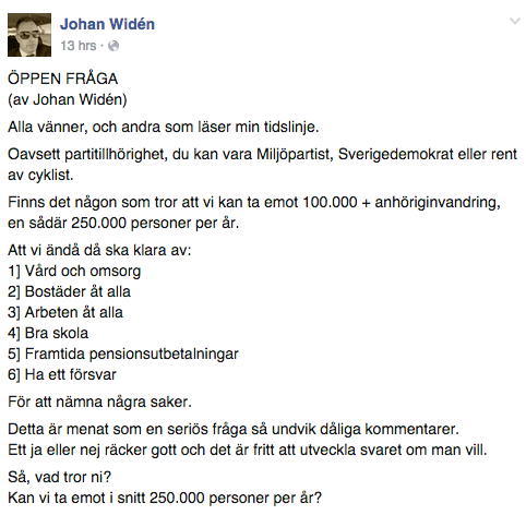 Johan Widén, SD (ej att sammanblanda med moderaten med samma namn), frågar i ett vitt spritt inlägg (han har även lagt upp samma text i SD-grupper) om vi kan ta emot 250.000 personer om året i Sverige. På en direkt fråga i kommentarerna om huruvida han verkligen anser att så många kommer att invandra ändrar han sig en smula, och skriver att det kommer att komma 100.000-250.000 personer, men han korrigerar inte inlägget.