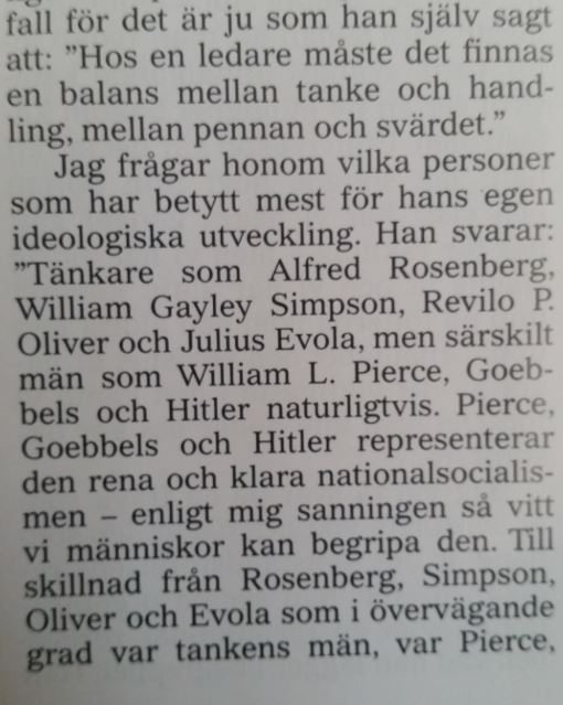 ”Nationalsocialismen är det ursprungliga, naturliga och vetenskapliga sättet att tänka och se på världen. Det är både en återgång till våra förkristna förfäders sätt att tänka samt en högre insikt om vår plats i kosmos, en högre medvetenhet som vi har lyckats nå genom rasens ansamlade historiska erfarenheter och vetenskapliga upptäckter… Detta är inte en fråga om vem som är ”rättlärd” eller inte, utan är en fråga av största praktiska vikt: Vi kan inte hoppas att kunna besegra Sion om vi inte dessförinnan kan resa oss över det nuvarande systemet. Detta innebär att vi måste leva som vi lär, nationalsocialismen måste härska inom oss före vi kan hoppas att den även skall komma att segra omkring oss!” (Klas Lund 2011)