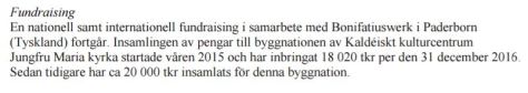 I årsredovisningen för katolska kyrkan kan vi läsa att de just nu samlar pengar för en kaldéisk kyrka, för de många syriska flyktingar som kommit hit de sista åren; kyrkan heter Jungfru Maria Kyrka.