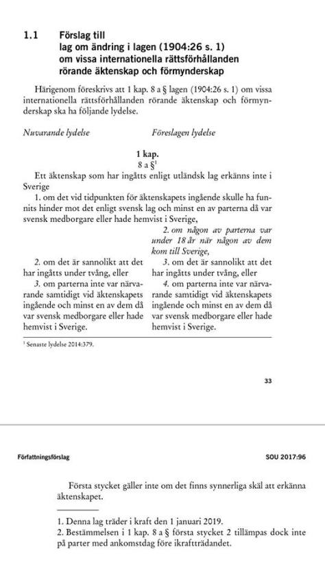 5 december 2017 kom så ett pressmeddelande som bekräftar att det inkommit ett betänkande med förslag som innebär att alla barn i Sverige ska ha samma skydd mot barnäktenskap. Förslaget, som föreslås träda i kraft 1 januari 2019, kommer att innebära att barnäktenskap som ingåtts utomlands, oavsett om det finns anknytning till Sverige eller inte, inte kommer att erkännas.