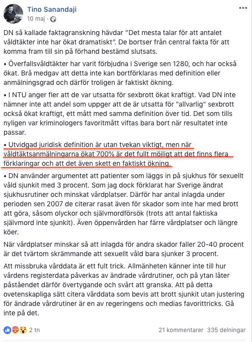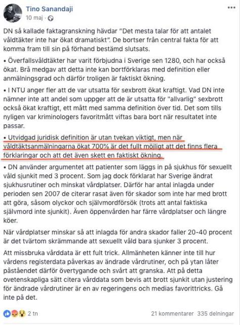 ”Våldtäktsanmälningarna har ökat med 700%”, påstod Sanandaji i ett Facebook-inlägg den 10 maj i år.