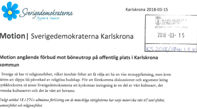 Det var den 15 mars 2018 som SD Karlskrona lämnade in motionen ”Motion angående förbud mot böneutrop på offentlig plats i Karlskrona kommun”.