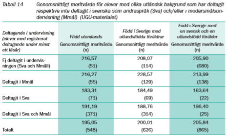 Men även elever med en svensk och en utlandsfödd förälder som har deltagit i modersmålsundervisningen har ett jämförelsevis högre meritvärde. För utlandsfödda elever finns ett motsvarande högt meritvärde för eleverna som inte alls har deltagit i dessa ämnens undervisning.” (Källa: Skolverket)