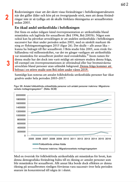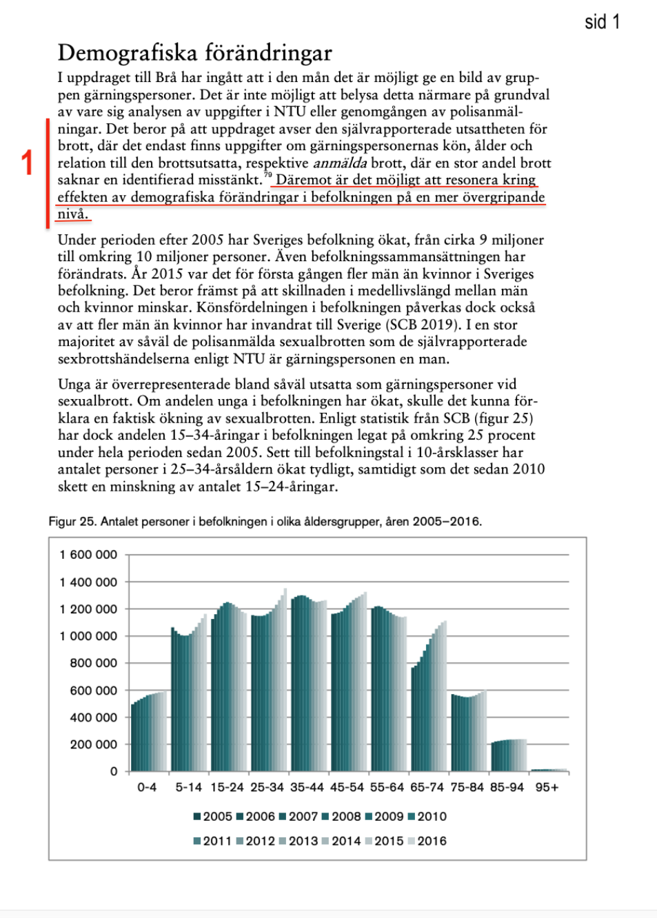 punkt 1. Dessa sidor handlar om en DEMOGRAFISK ANALYS. Man försöker alltså INTE säga något konkret om enskilda fall av sexualbrott eftersom det är omöjligt med den information om förövare som BRÅ har i detta sammanhang – polisanmälningar och NTU. Det rapporten gör är att ”resonera kring effekten av demografiska förändringar på en mer övergripande nivå”. Dvs hur förändringar i befolkningen som helhet kan ha påverkat den ökning som förutsätts ha skett.