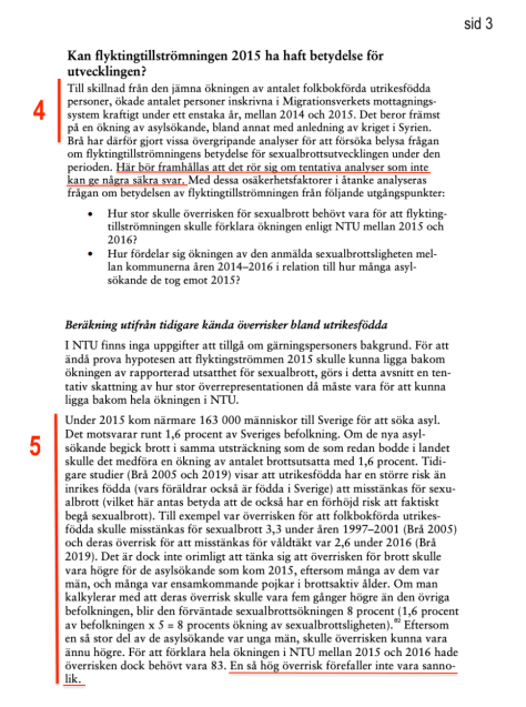 punkt 5. Rapporten använder sig av begreppet ÖVERRISK, och man gör en bedömning av hur stor överrepresentationen måste vara för att förklara hela ökningen i NTU. Man kommer fram till en överrisk på 83, dvs att på varje svensk sexualbrottsförövare skulle det gå 83 asylsökande sexualbrottsförövare.