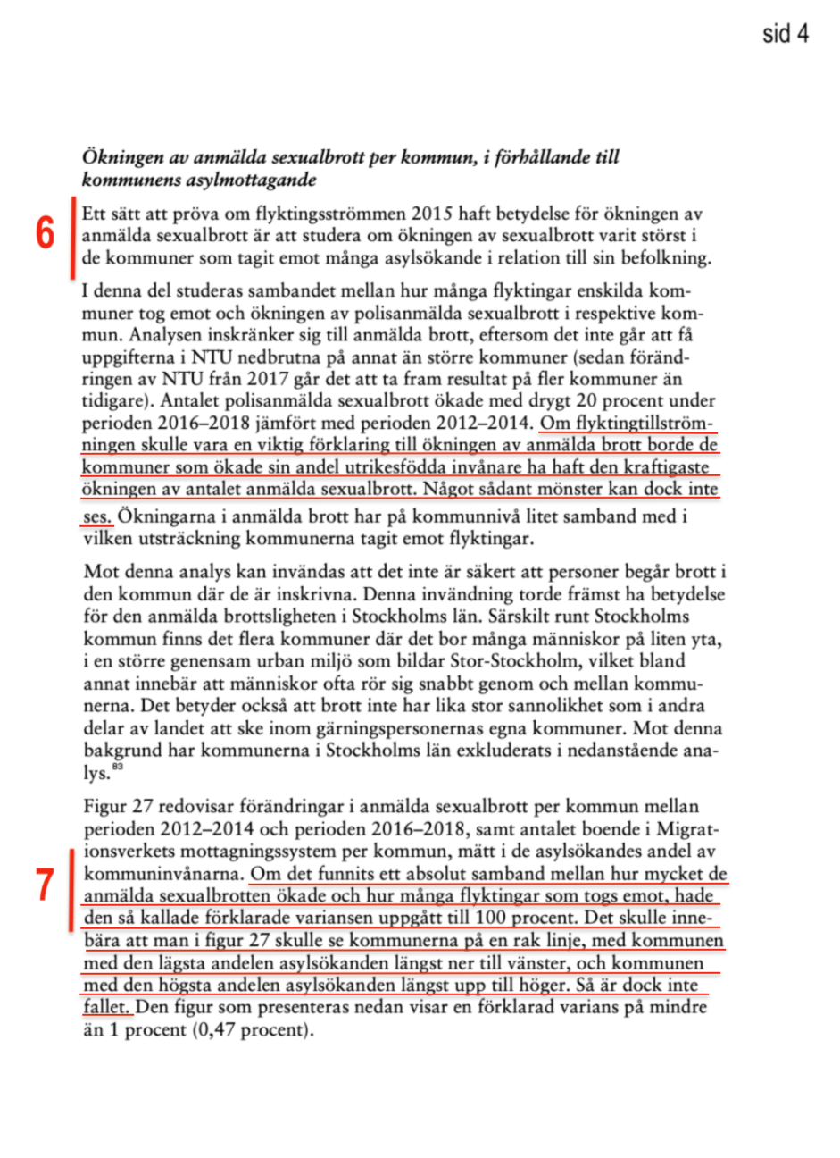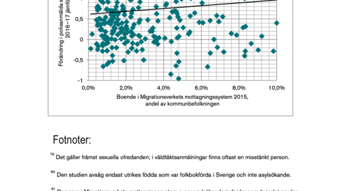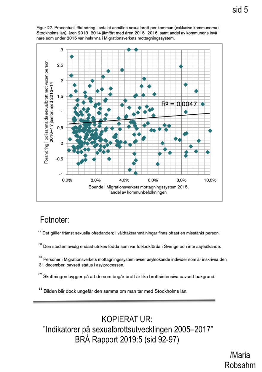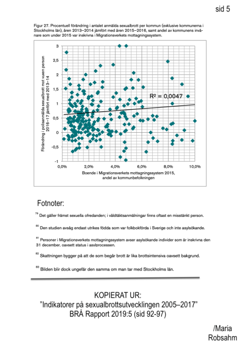 ”Om det funnits ett absolut samband mellan hur mycket de anmälda sexualbrotten ökade och hur många flyktingar som togs emot, hade den så kallade förklarade variansen uppgått till 100 procent. Det skulle innebära att man i figur 27 skulle se kommunerna på en rak linje, med kommunen med den lägsta andelen asylsökanden längst ner till vänster, och kommunen med den högsta andelen asylsökanden längst upp till höger. Så är dock inte fallet.” (Källa: BRÅ – utvecklingen av sexualbrott 2005-2017)