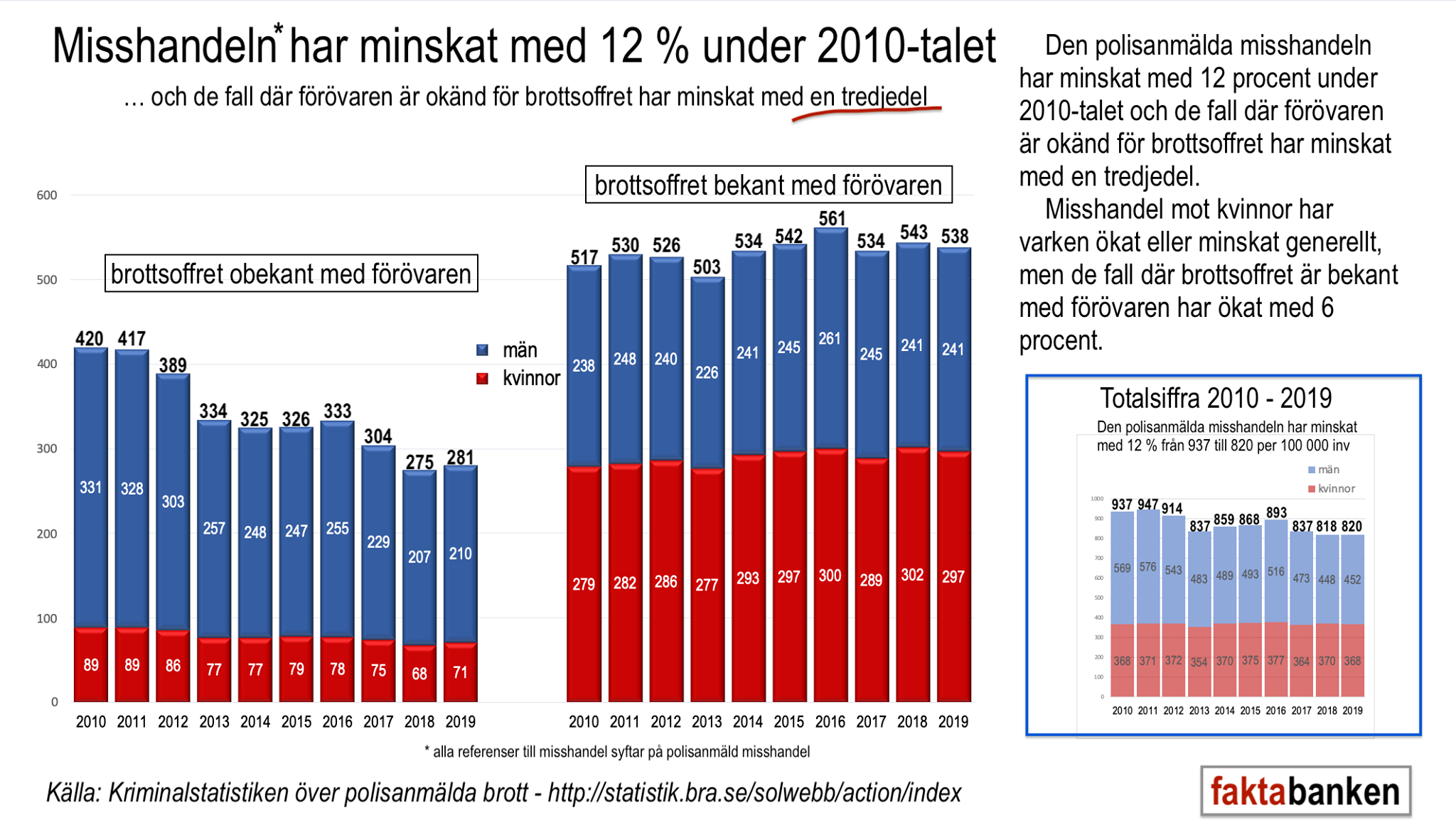Det förekommer ofta påståenden om att misshandeln i Sverige ökar. Men när vi nu kan summera siffrorna över 2010-talet i kriminalstatistiken över polisanmälda brott så ser vi att den polisanmälda misshandeln tvärtom har minskat.