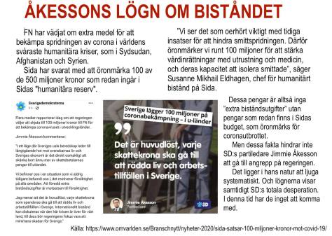 Just nu cirkulerar en bildsatt text från Sverigedemokraternas partihögkvarter. Det är Jimmie Åkesson som uttalar sig om det svenska biståndet i dessa coronatider.