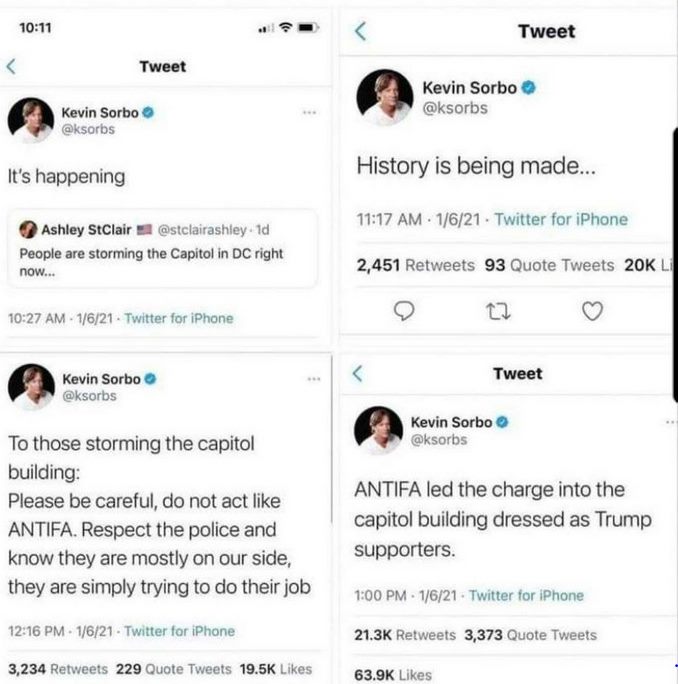 Kevin Sorbo är en offentlig person. Han är skådespelare, regissör, producent och författare. I sitt twitterflöde sprider han fakenews, bl a att Antifa och Black Lives Matter ska ha legat bakom stormningen av Capitolium 6 januari 2021.