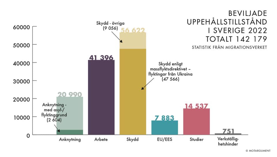 Totalt beviljades 142 179 uppehållstillstånd under 2022. Dessa fördelar sig enligt följande: