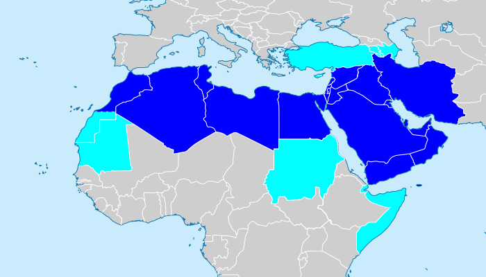 Algeriet, Bahrain, Egypten, Förenade Arabemiraten, Iran, Irak, Israel, Jemen, Jordanien, Kuwait, Libanon, Libyen, Marocko, Oman, Palestina, Qatar, Saudiarabien, Syrien och Tunisien.