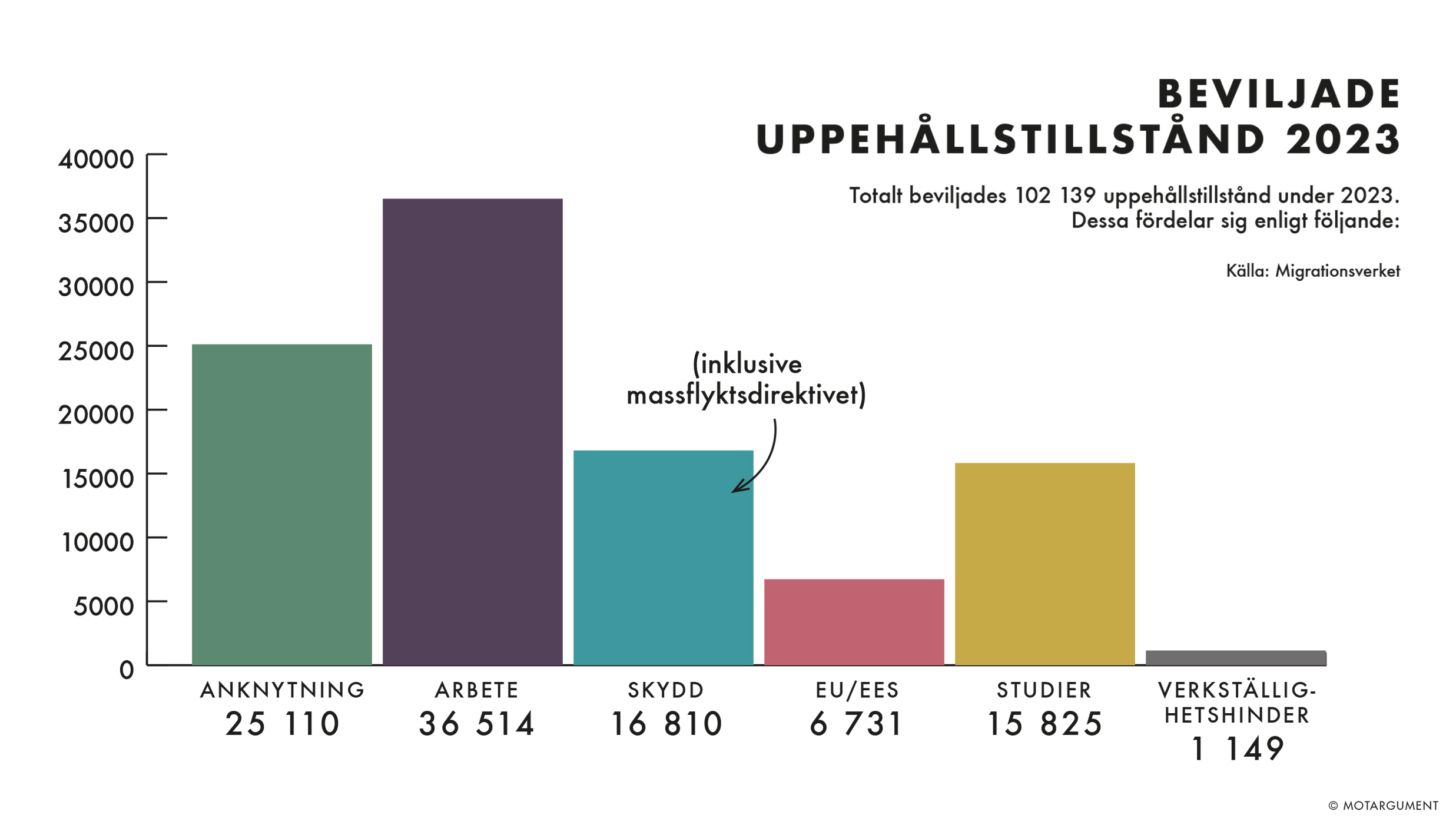 Totalt beviljades 102 139 uppehållstillstånd under 2023. Dessa fördelar sig enligt följande: