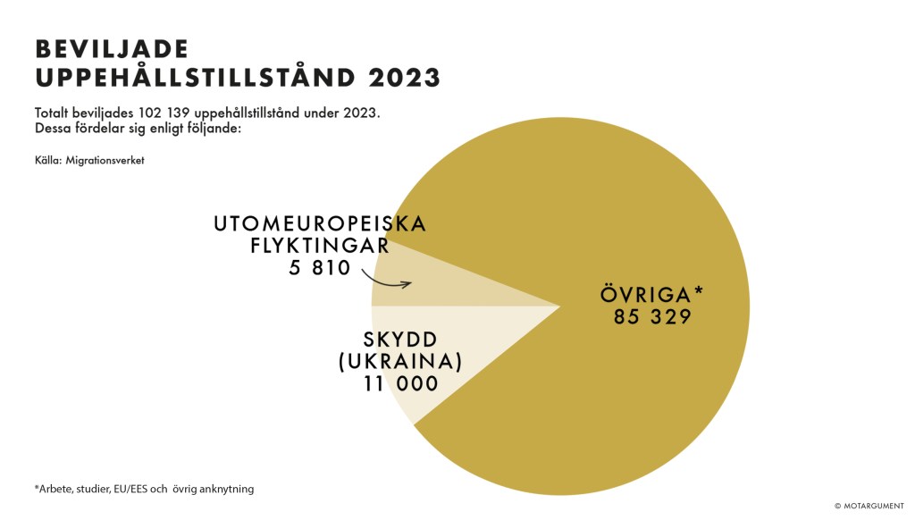 Om vi slår ihop de, enligt ”invandringskritikerna”, så kallade ”dåliga” grunderna för uppehållstillstånd blir siffrorna 16 810 + 2 114 + 1 149 personer = 20 073 (Den första siffran är siffran för asyl (skydd), den andra siffran är siffran för uppehållstillstånd som anhörig till en person som har asyl-/flyktinggrunder, och den tredje siffran är verkställighetshinder. Antalet beviljade uppehållstillstånd 2023 enligt massflyktsdirektivet, dvs flyktingar från Ukraina, är 11 000. Medan den totala siffran på 2023 års beviljade uppehållstillstånd är 102 139. Om vi räknar ut procentandelen ser vi att knappt 20 % av alla beviljade uppehållstillstånd grundar sig på asyl och anhöriganknytning relaterat till asyl-/flyktinggrunder. Alltså ca ett av fem: 1/5.