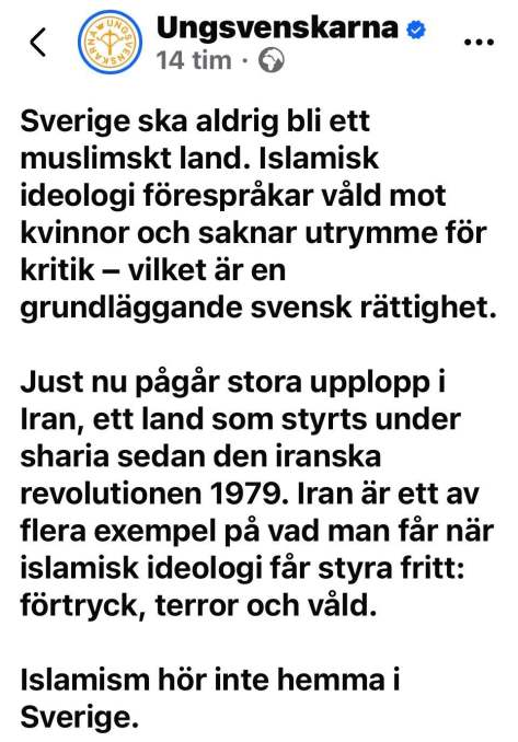 Ungsvenskarna, dvs Sverigedemokraternas ungdomsförbund, hävdar att islamism inte hör hemma i Sverige och använder Iran som varnande exempel. Samtidigt handlar ett av deras senaste inlägg om att Sverige aldrig får bli “ett muslimskt land”. Inlägget bygger på kommunikation om islamism egentligen som ett sätt att attackera och misstänkliggöra muslimer som en föreställd enhetlig grupp, eftersom inlägget bl a bygger på en felaktig sammanblandning av samhälle, land, stat och nation. Ironiskt nog är inlägget negativt emot muslimer samtidigt som utvecklingen i Iran visar att muslimer stödjer demokratiska värderingar.