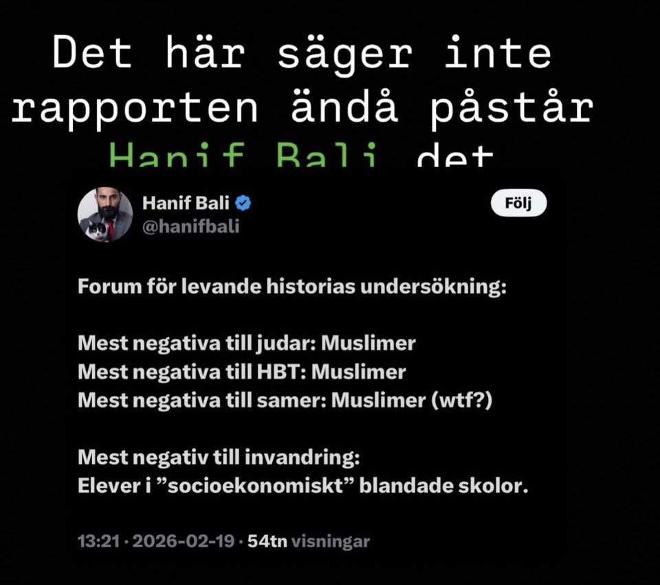 När en offentlig person med stor räckvidd påstår att en statlig undersökning visar något den inte visar, är det inte längre en fråga om “olika tolkningar”. Det är en fråga om ansvar. Moderaternas Hanif Bali har på sin plattform hävdat att en rapport från Forum för levande historia pekar ut muslimer som mest negativa till judar, HBTQI-personer och samer. Detta saknar stöd i rapporten.