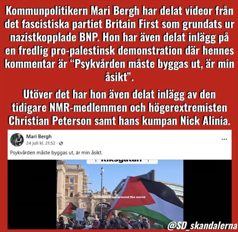 TTELA kan nu avslöja att hon utöver att vara flitig inom politiken även är en mycket aktiv användare av sociala medier där hon bl a sprider rasideologiskt och högerextremt material. Bergh har nämligen delat videor från det fascistiska partiet Britain First som grundats ur det ökända nazistkopplade partiet British National Party. Hon har även delat inlägg på en fredlig pro-palestinsk demonstration där hennes kommentar är “Psykvården måste byggas ut, är min åsikt”. Utöver det har hon även delat inlägg av den tidigare NMR-medlemmen och högerextremisten Christian Peterson samt hans kumpan Nick Alinia.
