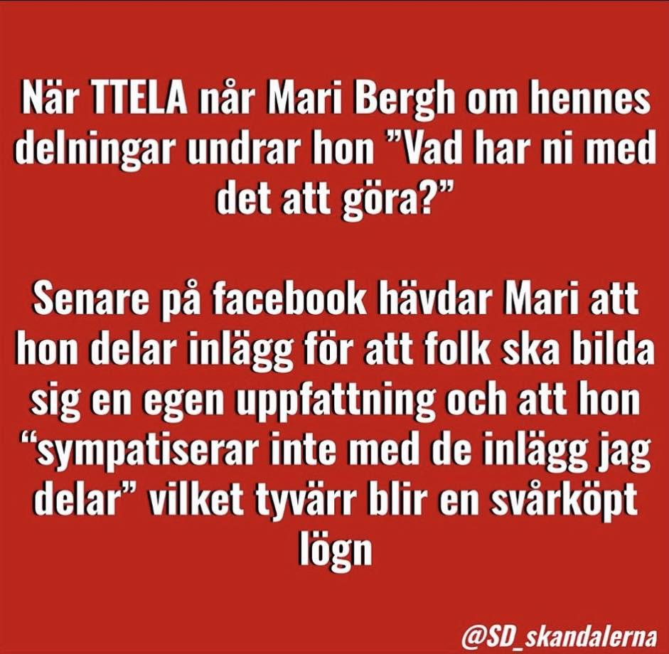 När TTELA når Mari Bergh om hennes delningar undrar hon ”Vad har ni med det att göra?”.