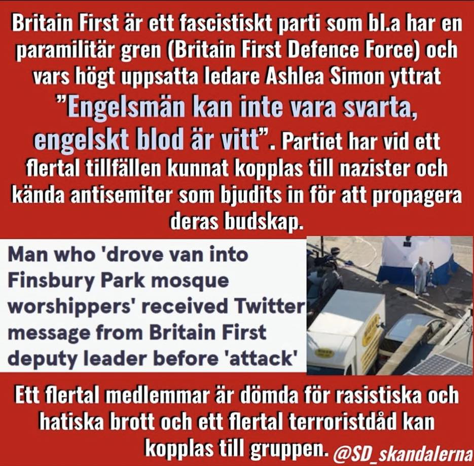 Britain First är ett fascistiskt parti som bl a har en paramilitär gren (Britain First Defence Force) och vars högt uppsatta ledare Ashlea Simon yttrat ”Engelsmän kan inte vara svarta, engelskt blod är vitt”. Partiet har vid ett flertal tillfällen kunnat kopplas till nazister och kända antisemiter som bjudits in för att propagera deras budskap. Ett flertal medlemmar är dömda för rasistiska och hatiska brott och ett flertal terroristdåd kan kopplas till gruppen.