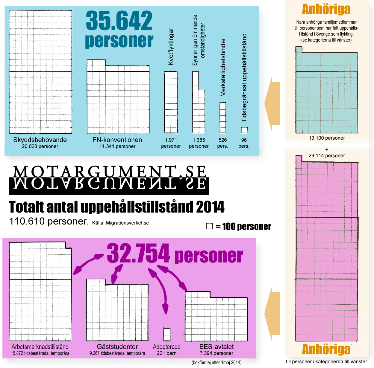 Migrationsverket redovisar kalenderåret 2014. Motargument har skapat en ”infographic” för att försöka motarbeta begreppsförvirringen. Motargument vill på detta vis försöka tydliggöra att antal utdelade uppehållstillstånd inte betyder att samtliga personer i statistiken automatiskt skulle vara arbetslösa eller bidragsberoende eller kommer stanna i Sverige permanent, på obestämd tid.
