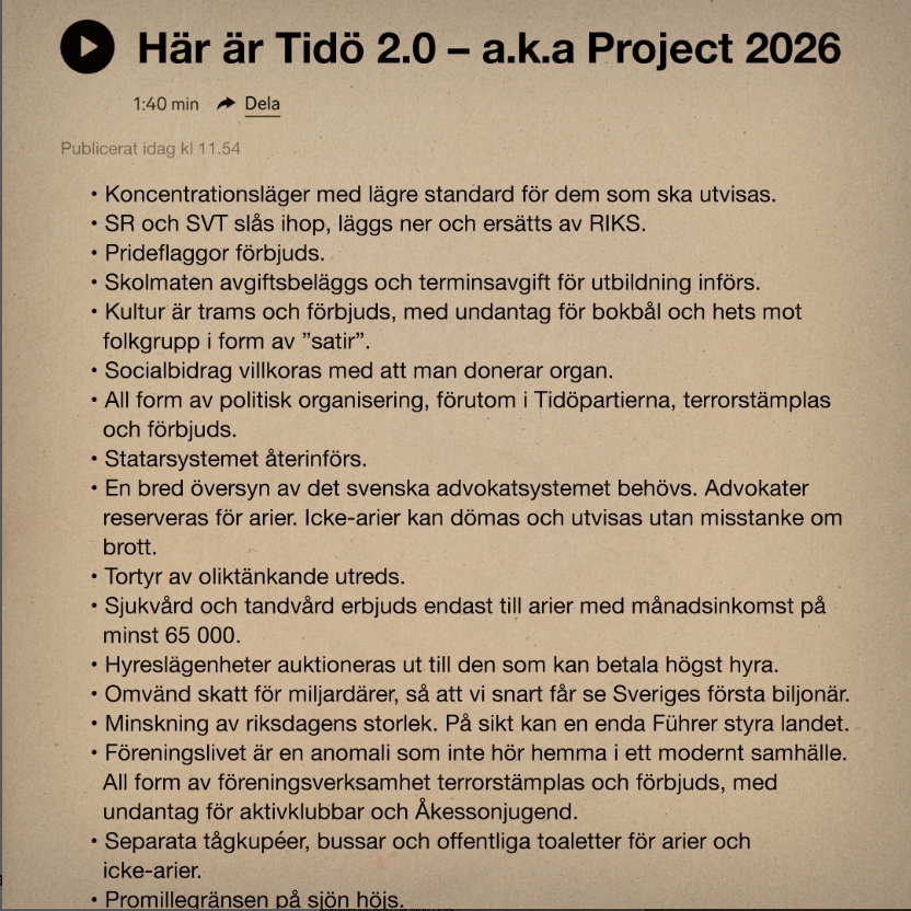 Har inget emot att man ger folk nya chanser men det bör förutsätta att det skett någon form av förändring. Om man granskar deltagarlistan kan man se att individerna som Jönsson bjudit in kännetecknas av motsatsen, dvs att man har grävt ner sig ännu djupare i positioner som trotsar både anständighet och förnuft. Människor som har Intervjuat Jönsson har lyft fram de uppenbara likheterna med en annan högersatsning, tidningen Bulletin: ”– Den typen av haveri finns inte på kartan här”, enligt Jönsson.