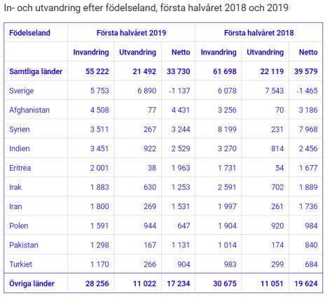 I tabellen nedan finner vi siffrorna för de vanligaste födelseländerna bland in- och utvandrade under första halvåret 2018 och samma period 2019.