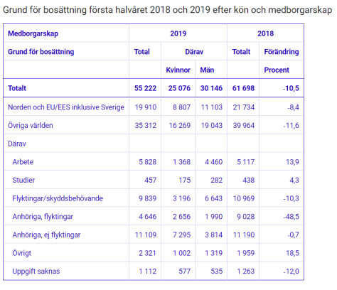 Antalet invandrade från länder utanför Norden och EU/EES har minskat första halvåret 2019 (totalt 35 312) jämfört med samma period 2018 (39 964). För att människor från dessa länder ska kunna bosätta sig i Sverige krävs uppehållstillstånd.