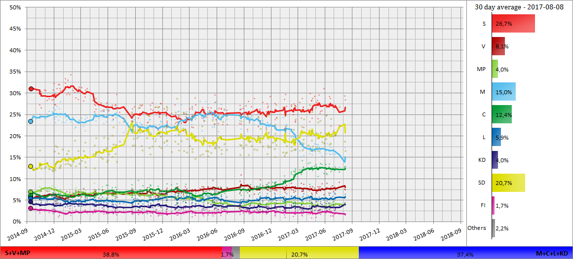 Sätter vi dessutom detta i kontexten av det rådande inre tumultet inom både SD och deras presumtiva samarbetspartner Moderaterna och Kent Ekeroths rättshaveristiska härdsmälta, är det egentligen självklart att presumtiva väljare lämnar partiet till förmån för stabilare alternativ med fötterna fast förankrade i demokratiska och humanistiska värderingar.