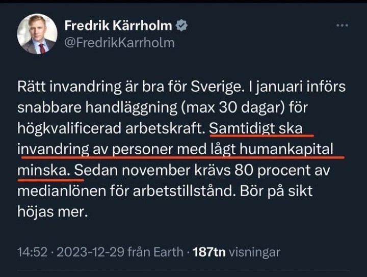 Inlägget avhumaniserar människor som söker sig till Sverige för att arbeta. Kärrholm kategoriserar människor utifrån det märkliga ordvalet ‘humankapital’. Han anser att människor med ‘lågt humankapital’ inte har någon plats i Sverige.