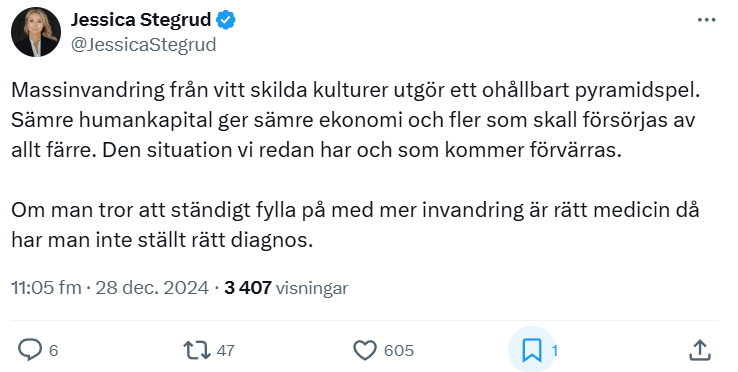 På Sverigedemokraternas officiella Facebookkonto slår man sig för bröstet över att Tidöregeringen, genom att höja försörjningskravet för arbetstillstånd, stryper arbetskraftsinvandringen så att den enbart omfattar personer som tjänar mer än 33 390 kronor (90% av medianlönen i Sverige).