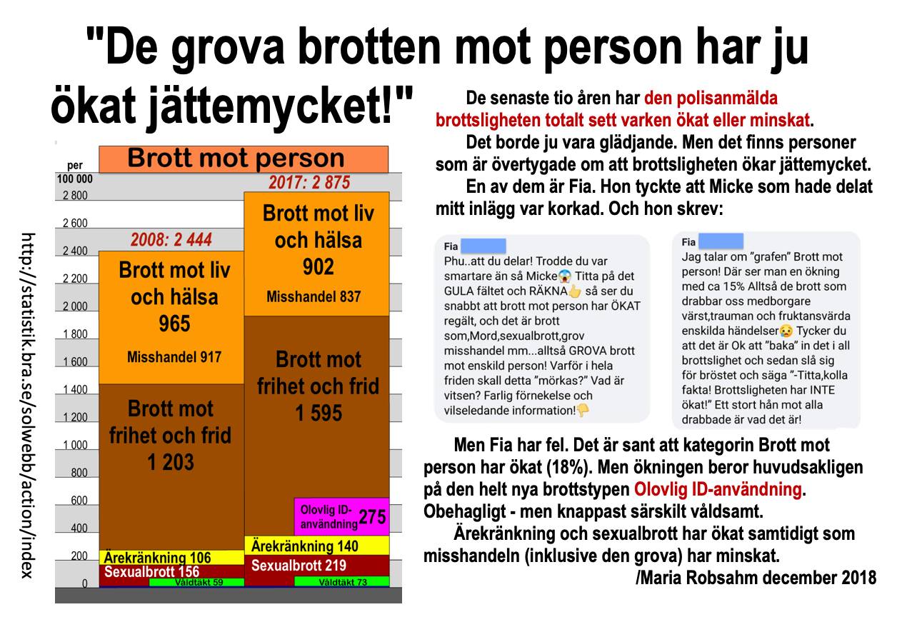 3. Den absolut vanligaste invändningen som jag har mött är påpekandet att medan totalsiffran varken har ökat eller minskat så har kategorin Brott mot person ökat det senaste årtiondet. Det är många som av detta har försökt leda i bevis att det ändå är sant att den grova våldsbrottsligheten har ökat.
