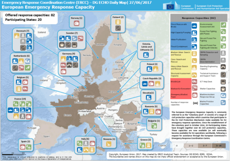 FALSKT. Det finns ett samarbete bland EU-länderna, koordinerat av ERCC (Emergency Response Coordination Centre), så att länderna kan hjälpa varandra vid krissituationer. I oktober 2014 etablerades en ”frivillig pool” bestående av 20 länder, och som tillhandahåller 82 civilskyddskapaciteter. Sverige har 7 stycken av dessa kapaciteter: Översvämningsskydd, högkapacitetspumpning, havsförorening, medicinsk luftevakuering, skyddskapacitet, teknisk assistans och support och ICT helpdesk.