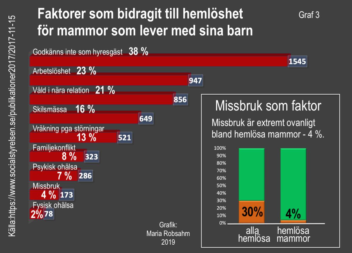 När vi tittar närmare på gruppen hemlösa mammor som lever med sina barn så ser vi hur verkligheten ser ut. I graf 3 återges de faktorer som huvudsakligen har bidragit till att dessa mammor hamnat i hemlöshet. Till att börja med kan vi konstatera att det är extremt ovanligt att dessa mammor har missbruksproblem. Det handlar om 4 % – vilket motsvarar genomsnittet för alla vuxna kvinnor i Sverige. Hemlösa mammor är alltså inte mer beroende än kvinnor i allmänhet.
