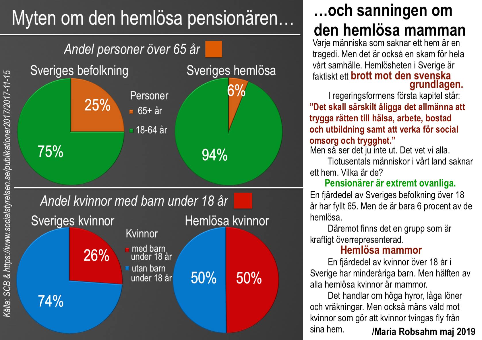 I den politiska debatten används inte sällan argument som polariserar, dvs ställer grupper mot varandra. Det florerar myter om att vi skulle ha väldigt många hemlösa pensionärer i Sverige. Detta är en felaktig uppfattning, då endast 6 % av hemlösa i Sverige är över 65 år.