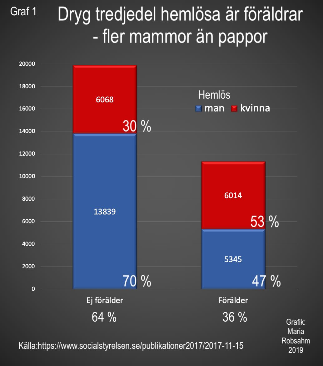 Det är något fler mammor (53%) som är hemlösa än pappor (graf 1).