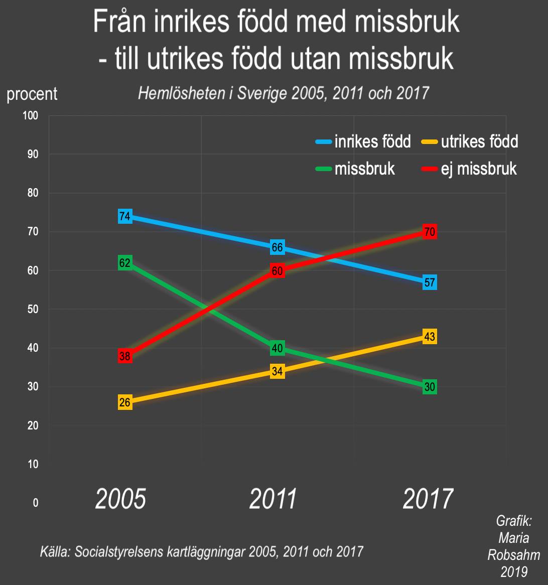 Den förändring som vi kan se är att de inrikes födda stadigt har minskat från 74 procent 2005 till 57 procent 2017. En ännu kraftigare förändring är andelen hemlösa med missbruksproblem. Från två tredjedelar år 2005 (62%) till en knapp tredjedel (30%) år 2017.