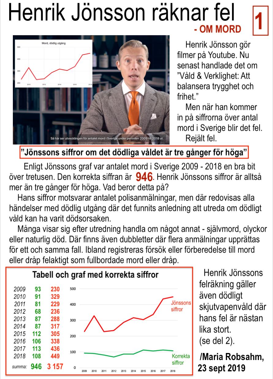Jag vill därför här och nu lyfta en person vid Henrik Jönsson som när det visade sig att han hade grundfel om antalet fall av dödligt våld i Sverige och antalet dödsskjutningar omedelbart tog till sig detta och raderade sin film.