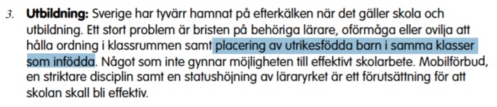 Högerpopulisterna hävdar att de nyanländas önskemål kontinuerligt prioriteras högst och att det är de svenska barnen som får betala priset. De menar att det är på grund av de nyanlända som de svenska barnen tvingas resa olagligt långt och att barn med särskilda behov placeras på skolor som inte kan ge det stöd som de behöver.