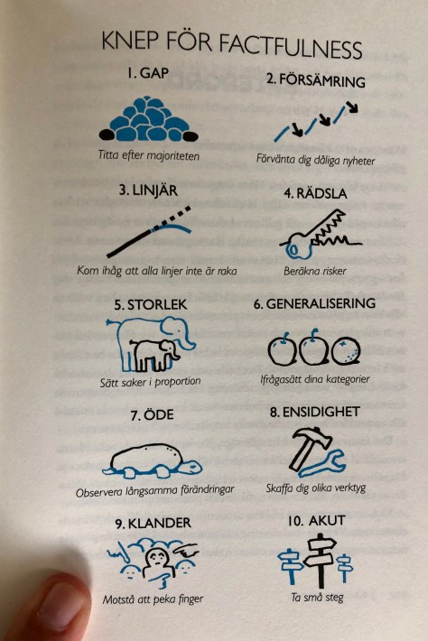 Jag rekommenderar Hans Roslings Factfulness, den ger perspektiv på hur man bör tänka när man hämtar in fakta, att man ska vara noggrann med att granska källor. Den ger också en bild av hur dåliga vi människor är på att svara på frågor som har med samhället, verkligheten och världen att göra. I studierna som gjorts är människor långt sämre än schimpanser på att besvara dessa frågor. Anledningen är att vi bygger vår samhälls- och omvärldsbild på våra fördomar, känslor, oro och åsikter.