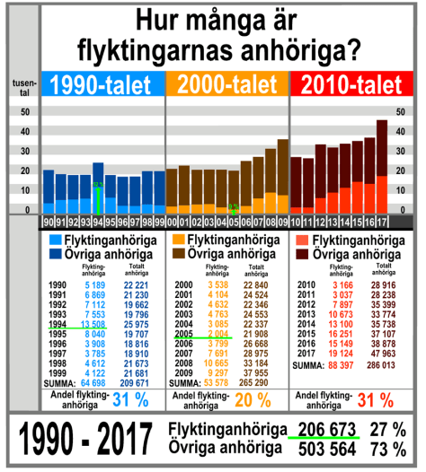 Under åren 1990 – 2017 fick 760 974 personer uppehållstånd som anhörig. Av dessa var 206 673 anhöriga till flyktingar – eller 27 procent.
