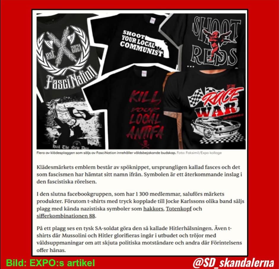 Expo beskriver följande om det som säljs i gruppen “plagg med kända nazistiska symboler som hakkors, Totenkopf och sifferkombinationen 88. På ett plagg ses en tysk SA-soldat göra den så kallade Hitlerhälsningen. Även t-shirts där Mussolini och Hitler glorifieras ingår i utbudet och tröjor med våldsuppmaningar om att skjuta politiska motståndare och andra där Förintelsens offer hånas.”