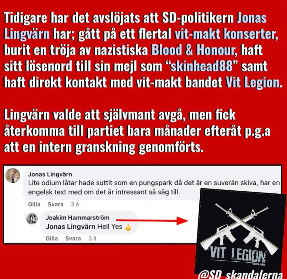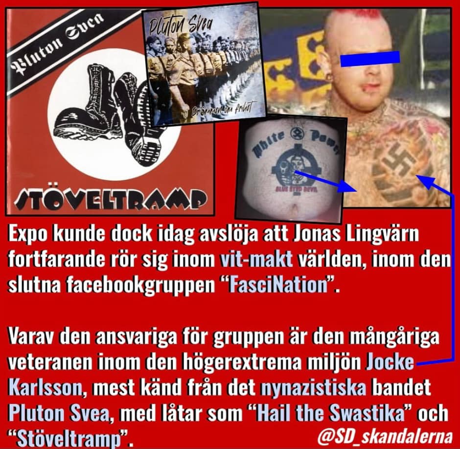Expo kunde dock idag avslöja att Jonas Lingvärn fortfarande rör sig inom vit-makt världen, inom den slutna facebookgruppen “FasciNation”. Varav den ansvariga för gruppen är den mångåriga veteranen inom den högerextrema miljön Jocke Karlsson, mest känd från det nynazistiska bandet Pluton Svea, med låtar som “Hail the Swastika” och “Stöveltramp”.