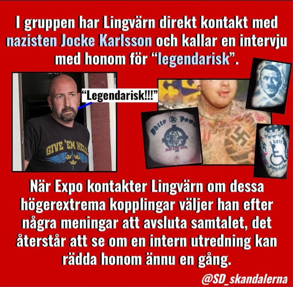I gruppen har Lingvärn direkt kontakt med nazisten Jocke Karlsson och kallar en intervju med honom för “legendarisk”. När Expo kontakter Lingvärn om dessa högerextrema kopplingar väljer han efter några meningar att avsluta samtalet, det återstår att se om en intern utredning kan rädda honom ännu en gång.
