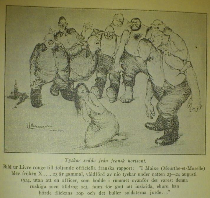 I alla tider har man beskrivit ”de andra”, eller ”fienden” som monster som vill våldta kvinnorna och barnen. Här är tre exempel. Ett från tysk press under första världskriget och två från fransk press.
