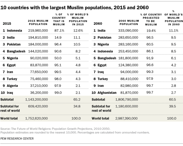 Prognosen för 2060 är att Indien, Pakistan, Nigeria, Indonesien och Bangladesh (i den ordningen) kommer att vara de länder i världen med störst muslimsk befolkning.