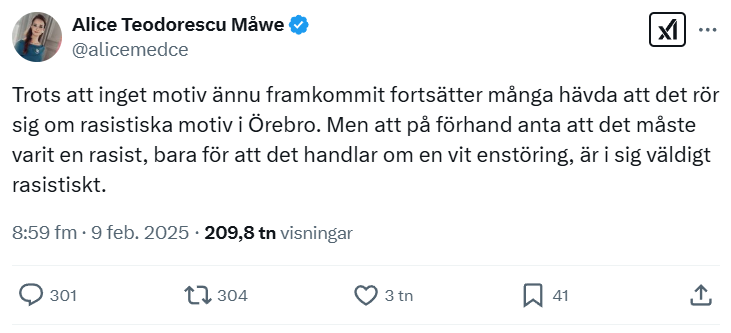 Vi får inte glömma att vi alla är en gemensam kollektiv del av mänskligheten, och har ett ansvar att ta avstånd från illgärningar, oavsett vem eller vilka som utför dem. Vi måste alla tydligt markera, och ta avstånd från, rasism, nazism, islamism och kommunism, och alla brott och skoningslösa handlingar, samt förtryck, som dessa genererat genom historien, och än idag.