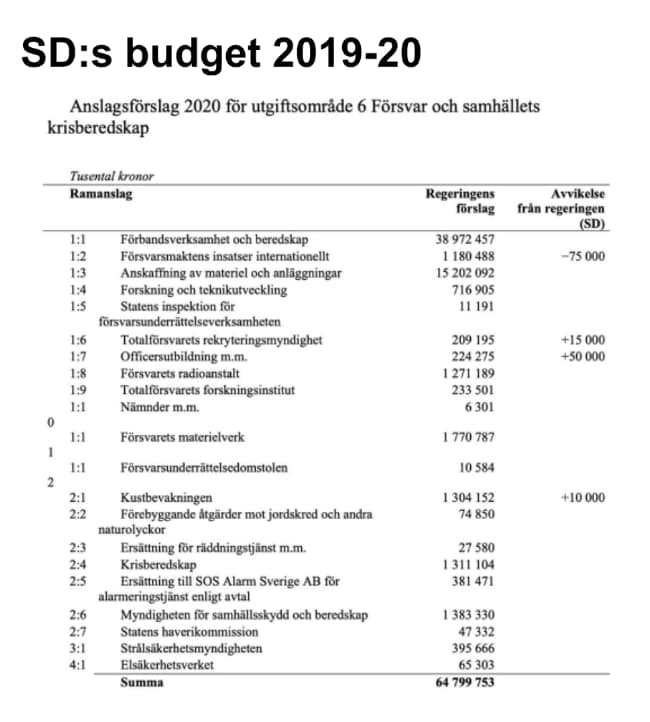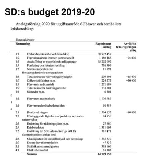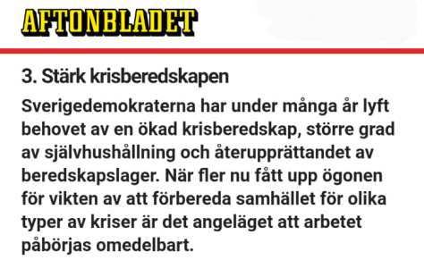 Enligt SD har de ”i många år lyft behovet av en ökad krisberedskap” och de påstår att de andra partierna först nu har insett detta – ”när fler nu fått upp ögonen för vikten av att förbereda samhället för olika typer av kriser.”