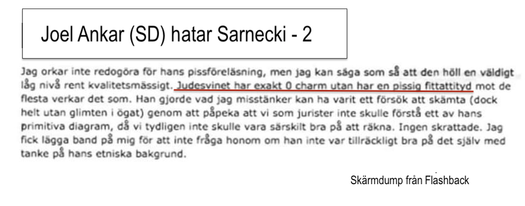 Och detta är bara en av en lång rad antisemitiska kommentarer om just Sarnecki. Inför sin redogörelse för partiledningen hade pressekreterare Gustafsson kontaktat Joel Ankar själv och bett honom att lista ”det han anser vara grovt” och ange i vilket sammanhang som han skrev kommentarerna.