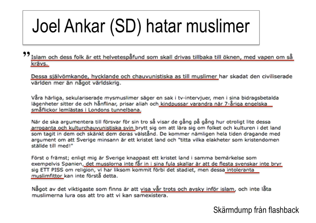 Men Ankar skriver inte bara om Sarnecki. I ett stort antal oerhört grova kommentarer visar han en närmast besinningslös rasism, hat mot muslimer och uttrycker sexualiserade våldshot mot kvinnor som genomgår abort.