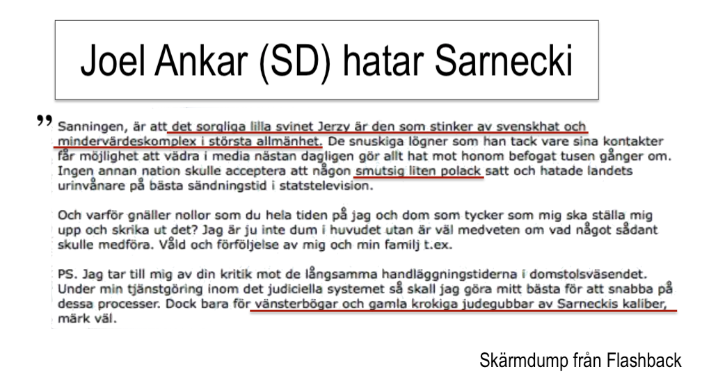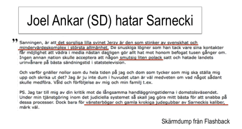 Och Ankar svarade. Han medgav att det var han som stod bakom kontot på flashback. Och han medgav en lång rad rasistiska och antisemitiska skrivningar och han medgav att han särskilt hade pekat ut Sarnecki. Återigen. Ankar själv erkände detta fullt ut – men försökte få det till att han ”hade genomgått en kaotisk period och att han var väldigt ung”. När det framkom att de senaste inläggen var från året innan – 2014 – bara några månader innan alltihop avslöjades föll detta ”försvar” samman.